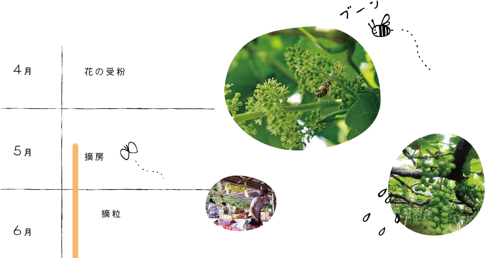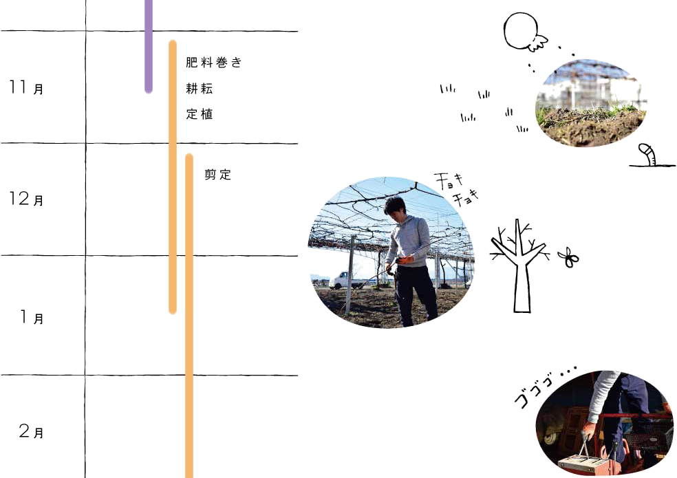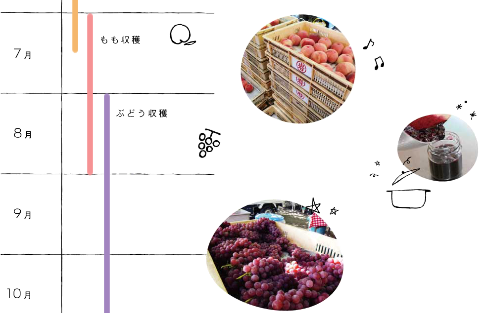 7月~11月に美味しいももや、ぶどうを収穫し、